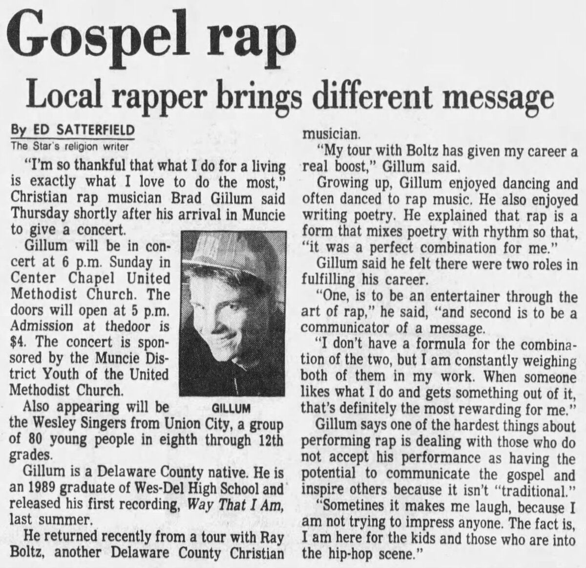 There's an article about Gillum in The Star Press, out of Muncie, Indiana dated February 27, 1993 where he talks about his goals as a rapper, as well as his tour with another very well-known christian artist, Ray Boltz. More digging is needed, but it seems like at least being from the same area might be a reason these two were able to connect and tour together (Here's a write-up about that interesting tour - Boltz, a Gaither, and a rapper!). Gillum doesn't appear in a newspapers.com search after 1995 - I wonder what he's up to now. (I don't think he's the same Brad Gillum that appears on LinkedIn because the college doesn't match.)